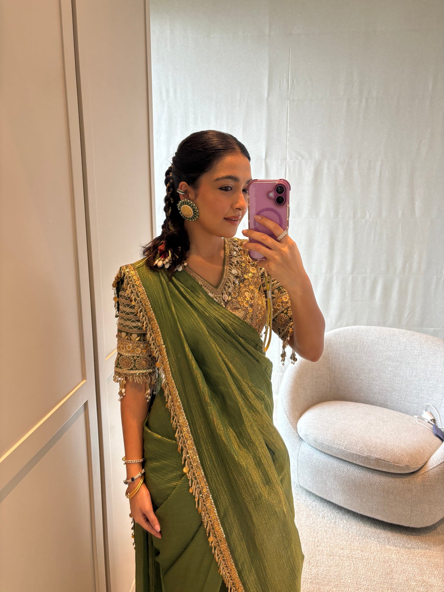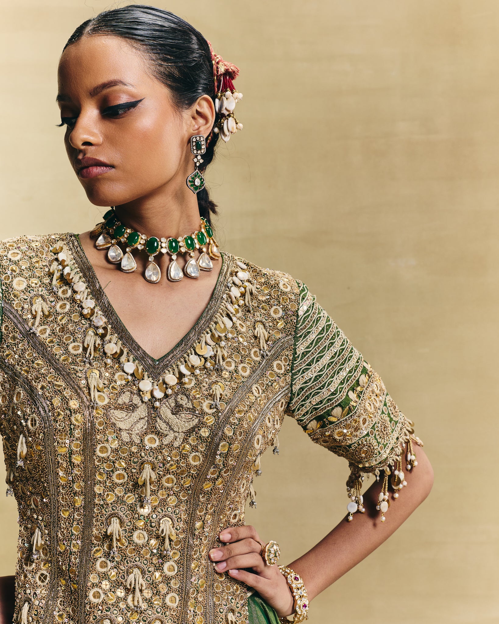 This festive hand embellished saree with the embroidered corset style blouse can be worn for a traditional sangeet or a wedding function.