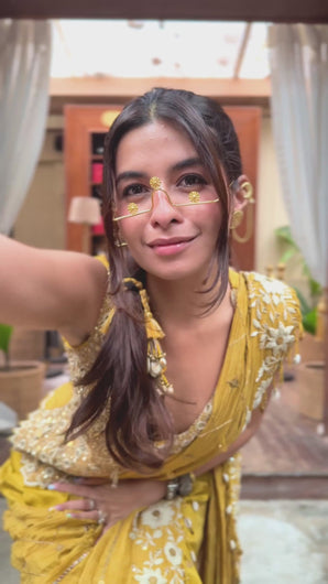 True to its name, the lovely blouse pairs well and works as a statement piece with the draped skirt or you could pair it with our low crotch pants/stitched saree.