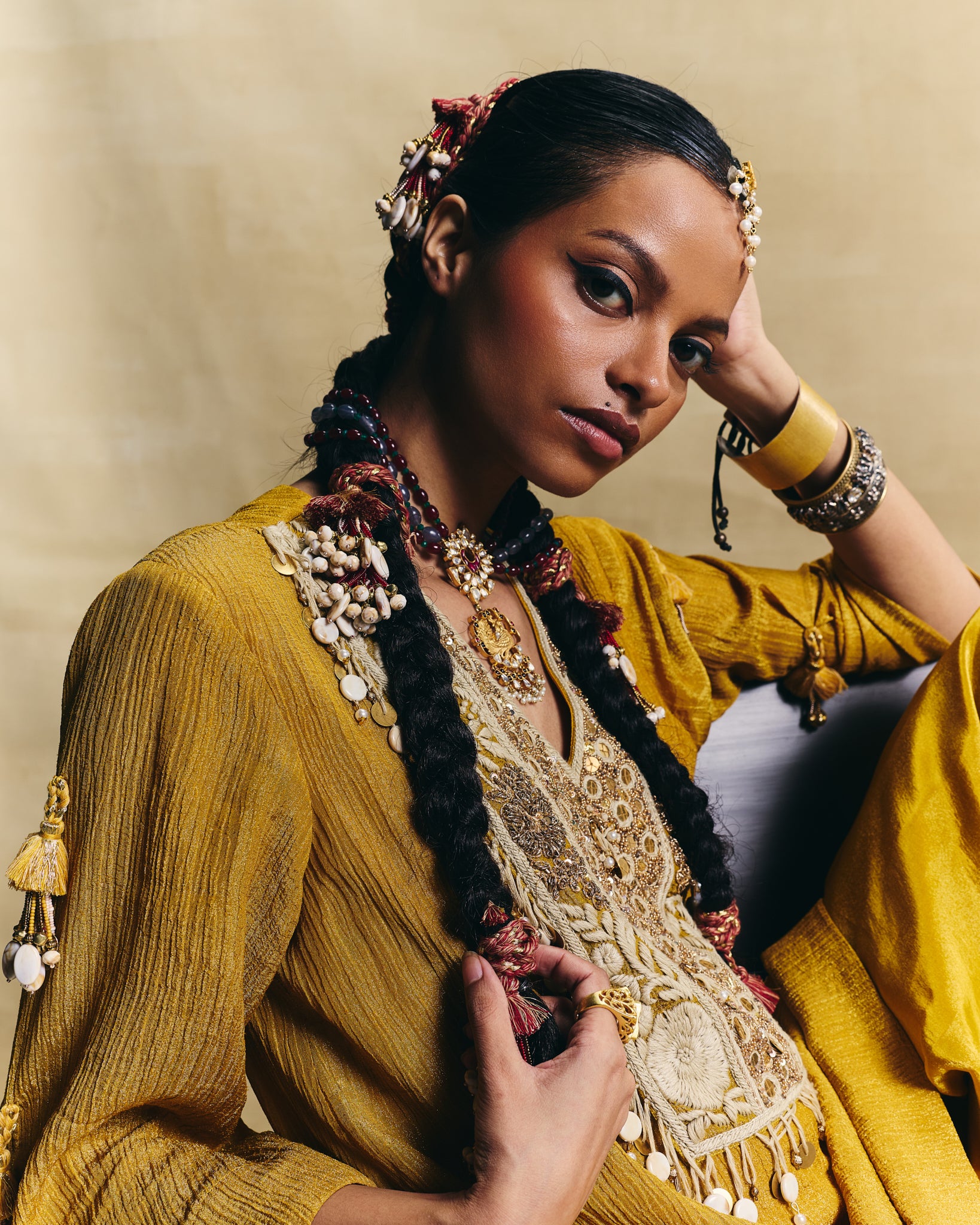 Dress it up with chunky kadas and stacked bangles along with temple jewellery.
