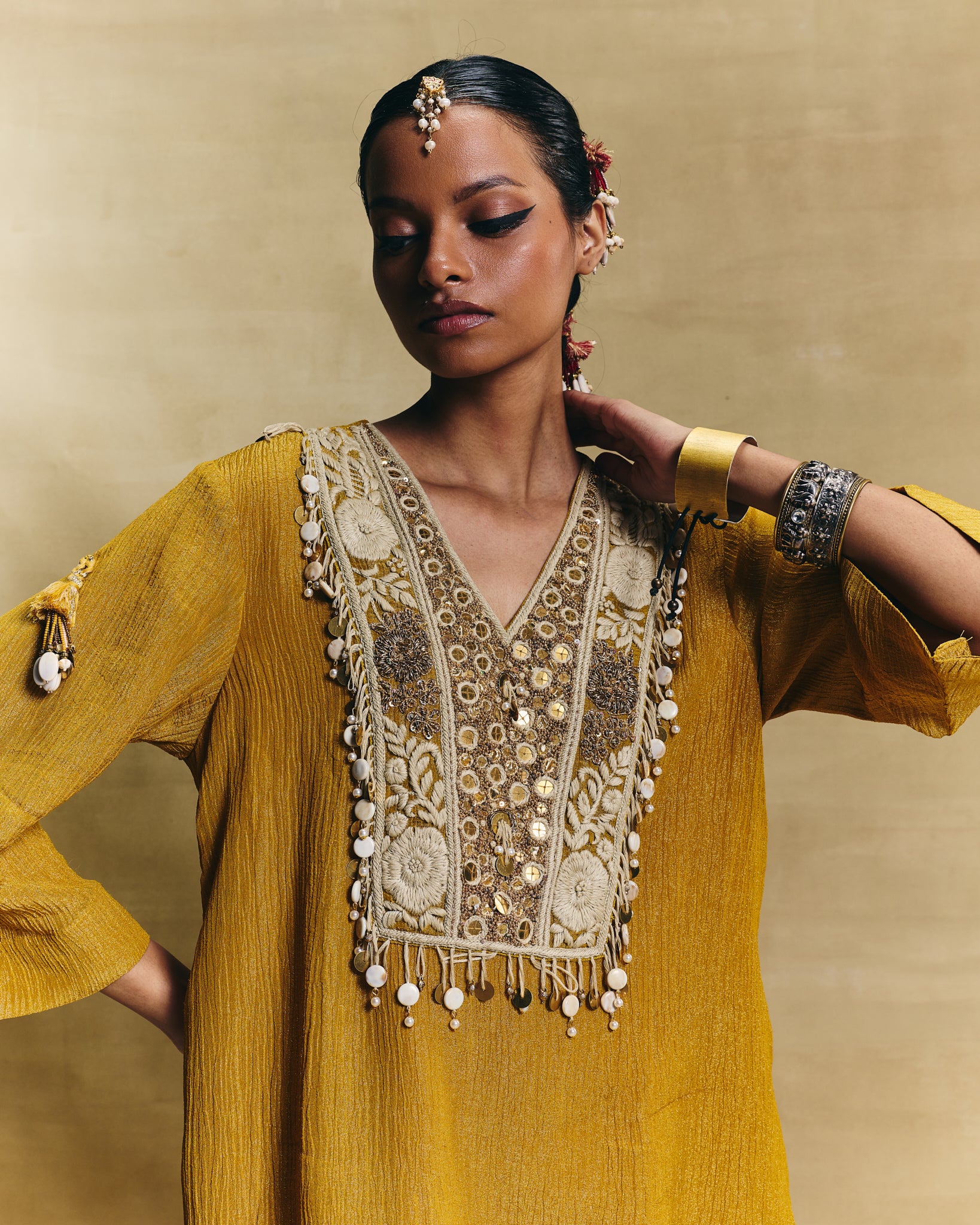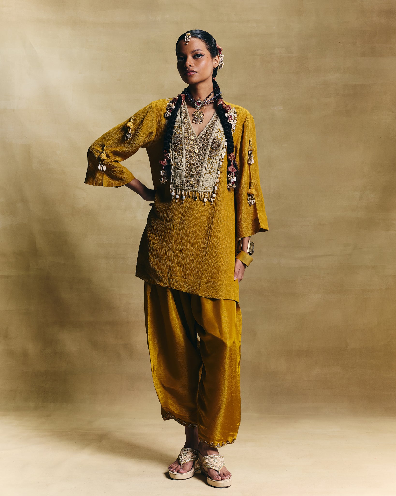 This statement yoke embroidered kurta paired with a salwar is a classic set for a traditional festive event.