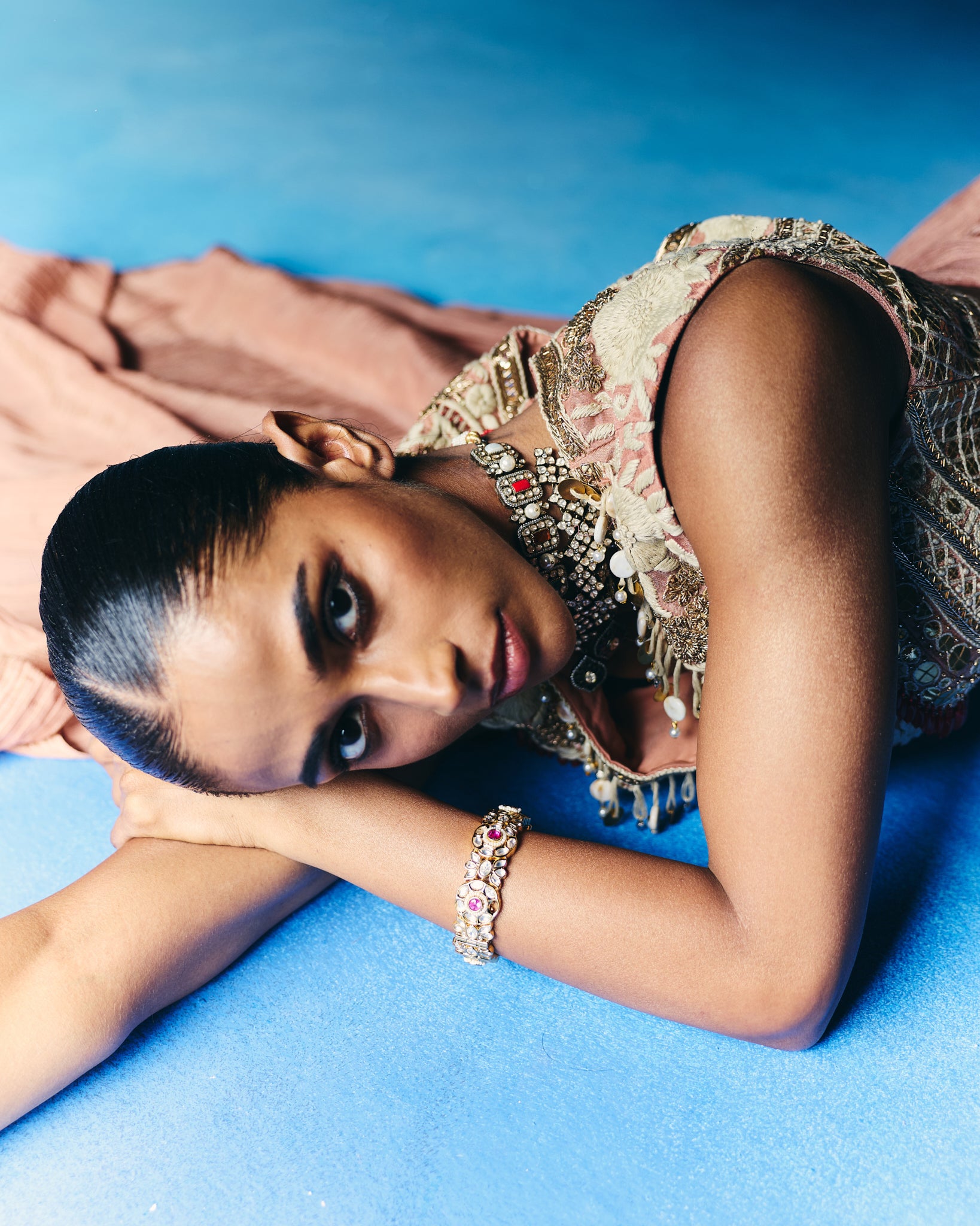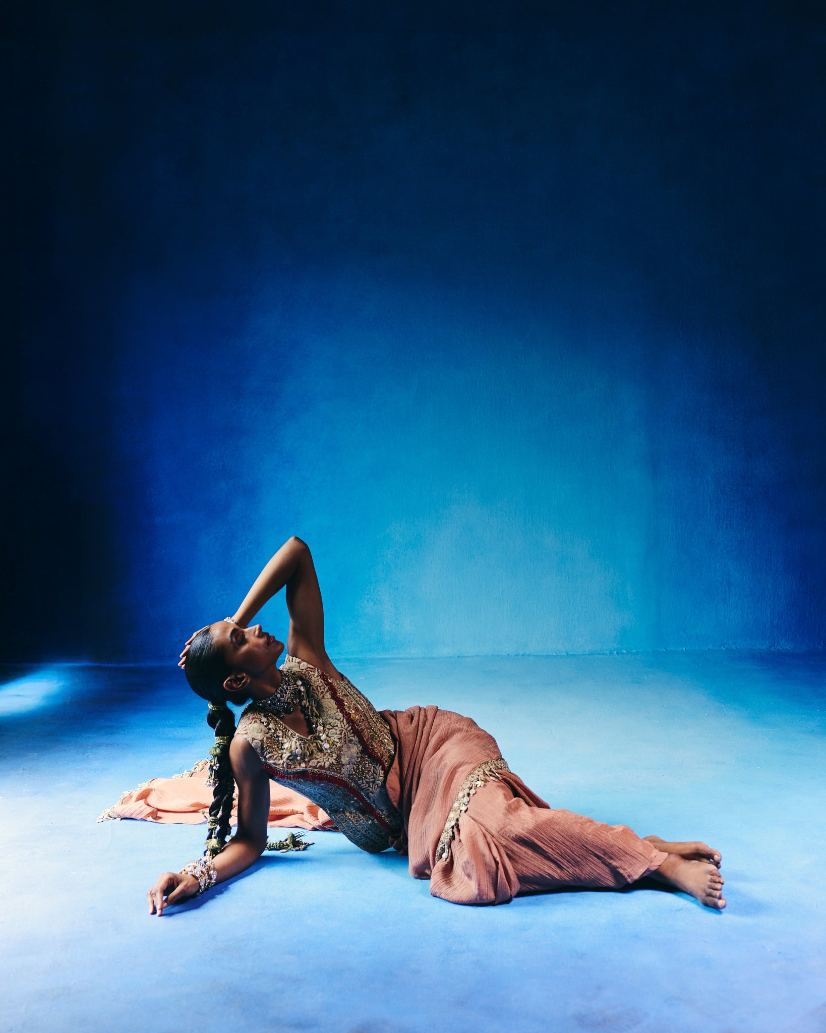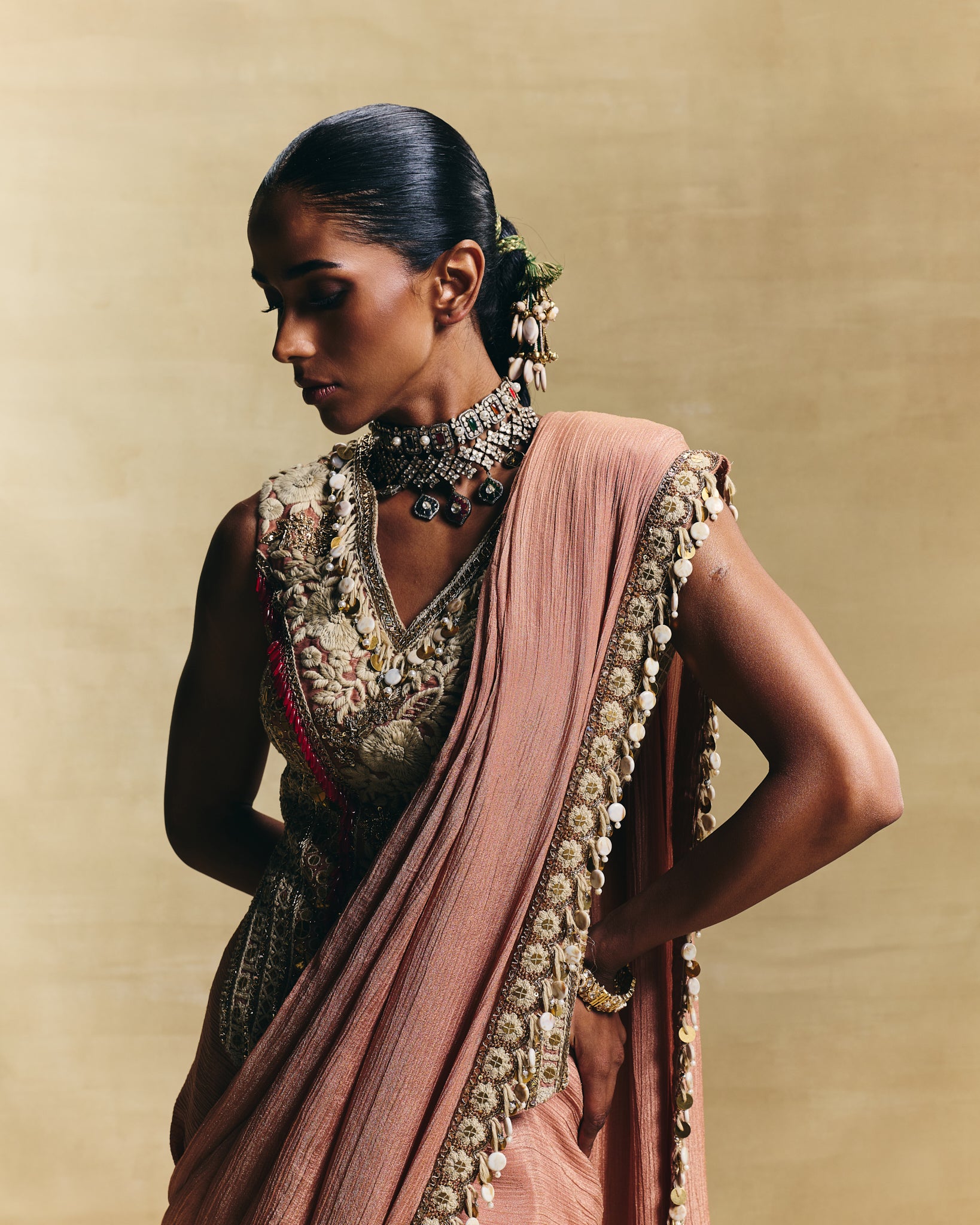 This festive hand embellished saree with the embroidered corset style blouse can be worn for a traditional sangeet or a wedding function.