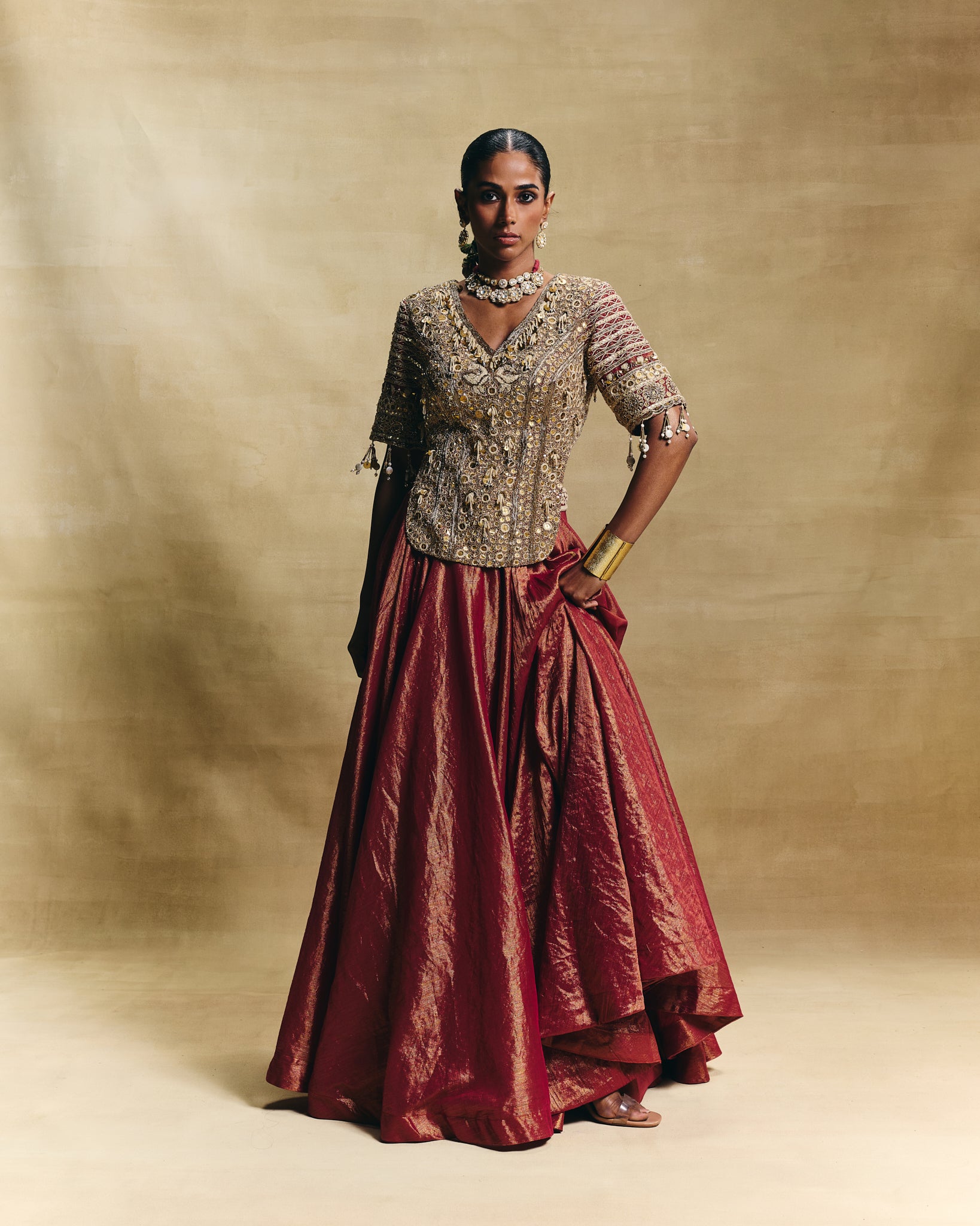 This set consists of a corset style hand embellished blouse paired with a voluminous skirt.