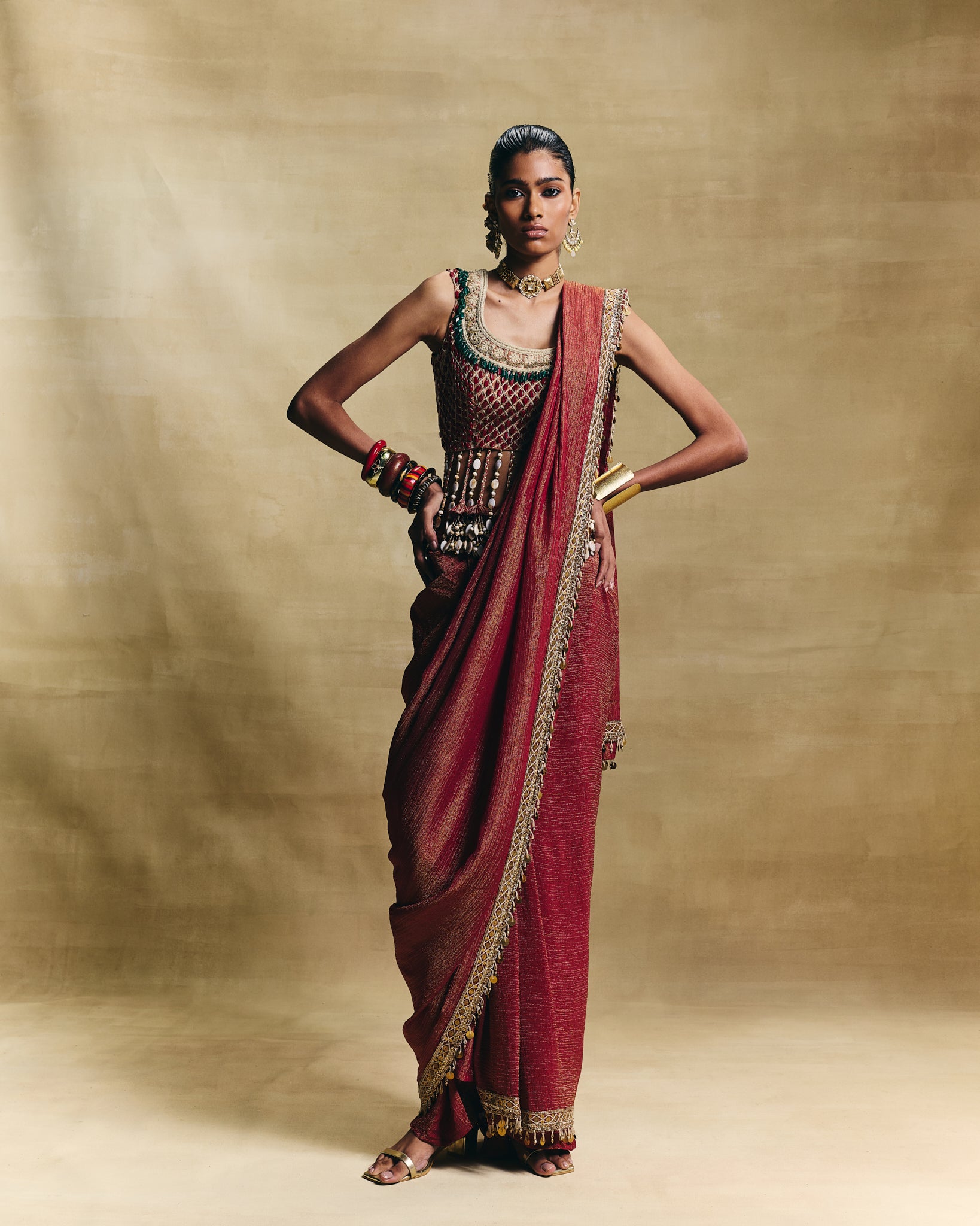 True to its name, the lovely blouse pairs well and works as a statement piece with the stitched saree or you could pair it with our low crotch pants/draped skirt.