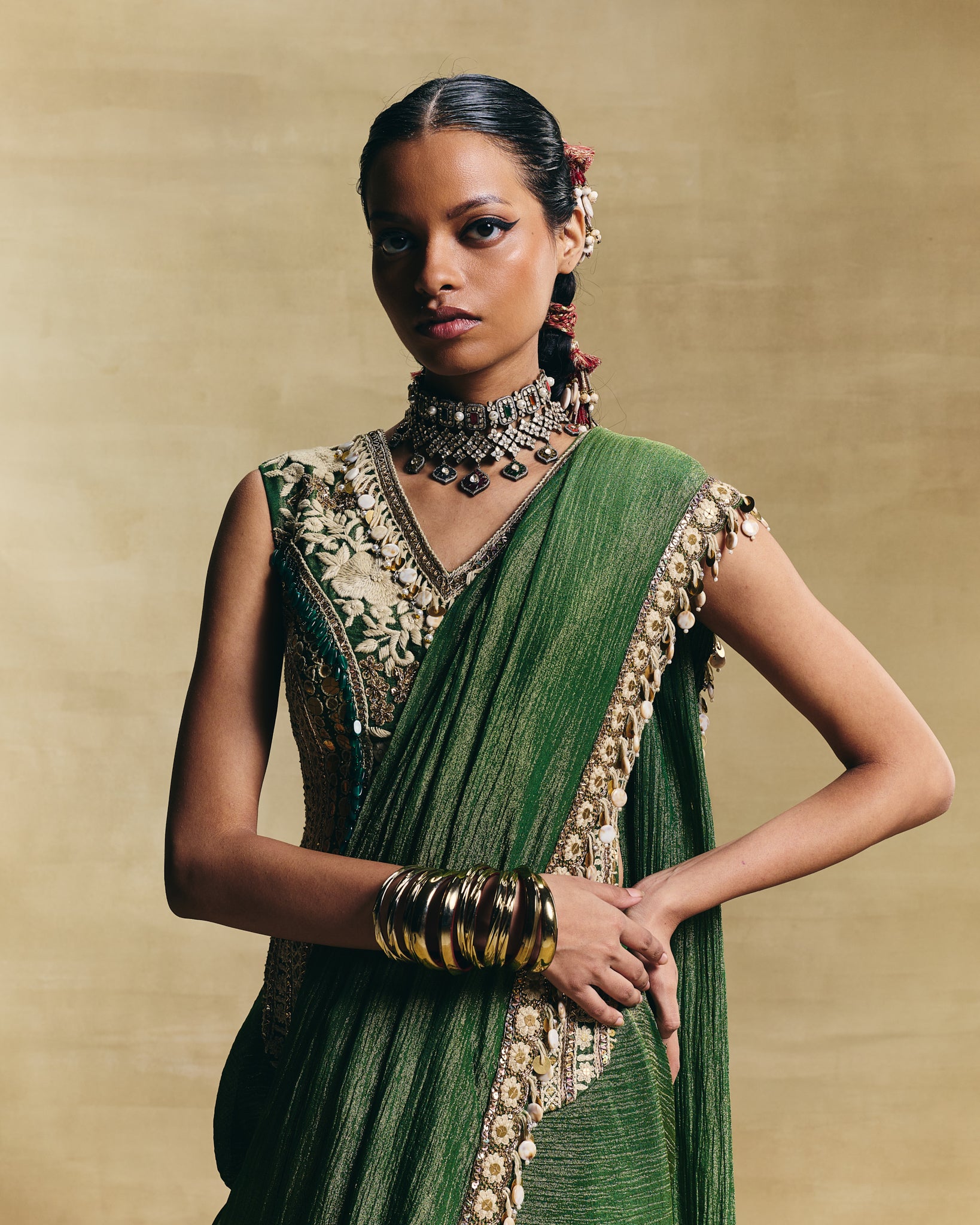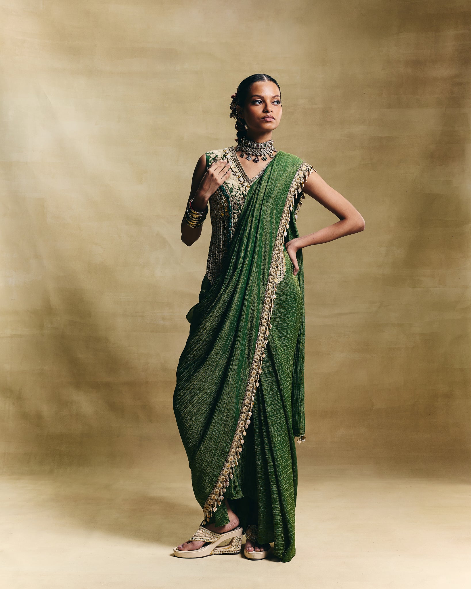 This festive hand embellished saree with the embroidered corset style blouse can be worn for a traditional sangeet or a wedding function.